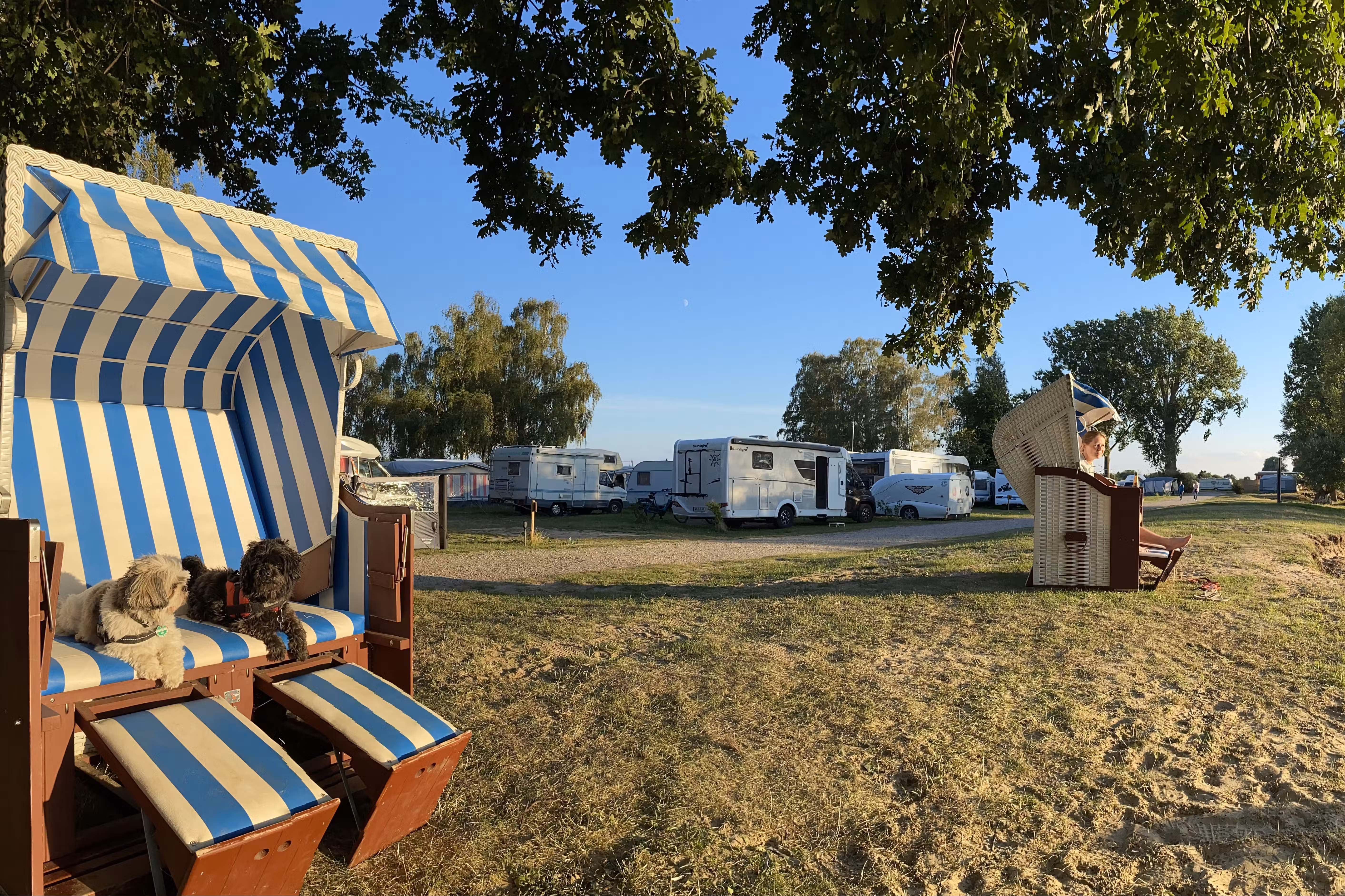 Für Zelte, Wohnmobile und Caravans verfügt der Campingplatz über insgesamt etwa 450 Touristenplätze plus weitere Dauerplätze. Viele davon sind frei wählbar und nicht parzelliert, dennoch bieten Bäume und Grünräume eine private Atmosphäre. Mobilheime und Holzhäuser sowie besondere Unterkünfte wie renovierte Vintage „Beach Camper“, Schäferwagen und Schlafstrandkörbe runden das Angebot ab. Am kleinen See und direkt an der Elbe fühlt man sich mitten in der Natur – ideal für Familien und Ruhesuchende.