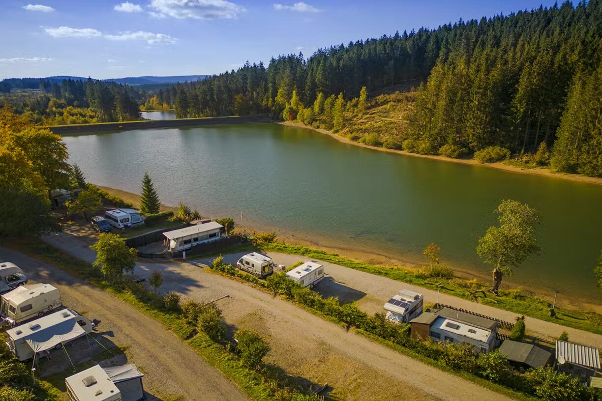 Der Campingplatz Das Kreuzeck liegt idyllisch mitten im Oberharz, direkt an einem klaren Waldsee auf etwa 600 m Höhe. Über sieben terrassierte Ebenen verteilen sich rund 200 Stellplätze, davon circa 140 für Urlaubsgäste und 60 für Dauercamper. Die meisten Plätze sind parzelliert, großzügig angelegt (80–120 m²), mit Strom ausgestattet und bieten auf etwa 70–80 % sogar Seeblick. Die terrassenförmige Hanglage sorgt dafür, dass jedes Camper-Plätzchen ruhig und von Grün umgeben ist – ideale Voraussetzung für erholsame Nächte fernab von Hektik und Durchgangsverkehr.