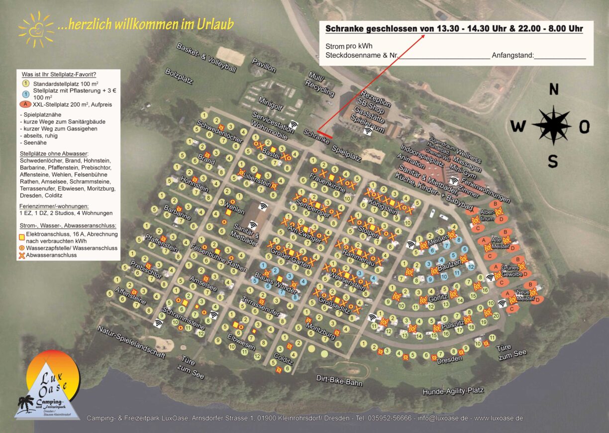 Die LuxOase zählt nicht ohne Grund zu den führenden Premium-Campingplätzen in Deutschland. Neben der hohen Servicequalität punktet der Platz auch mit einem gut durchdachten Sicherheitskonzept. Es gibt eine Erste-Hilfe-Station, Feuerlöscher an vielen Stellen und ein Notfallmanagement. Die Nachtruhe beginnt um 22 Uhr, was zu einer sehr angenehmen Atmosphäre beiträgt. Buchungen sind online möglich und eine Anzahlung ist nicht erforderlich. Besonders in der Hauptsaison wird eine Reservierung empfohlen. Der Platz achtet auf ein harmonisches Miteinander und erlaubt keine lauten Gruppen oder Partygesellschaften.