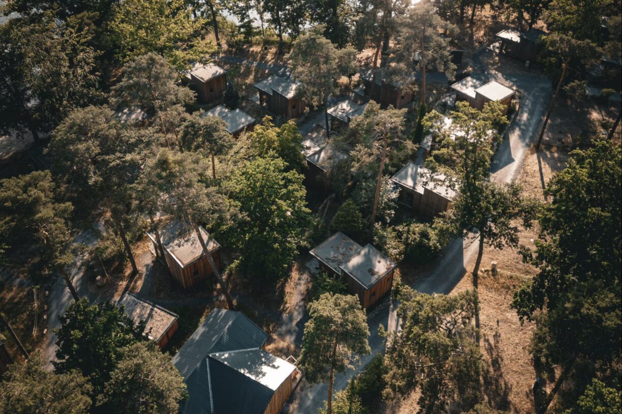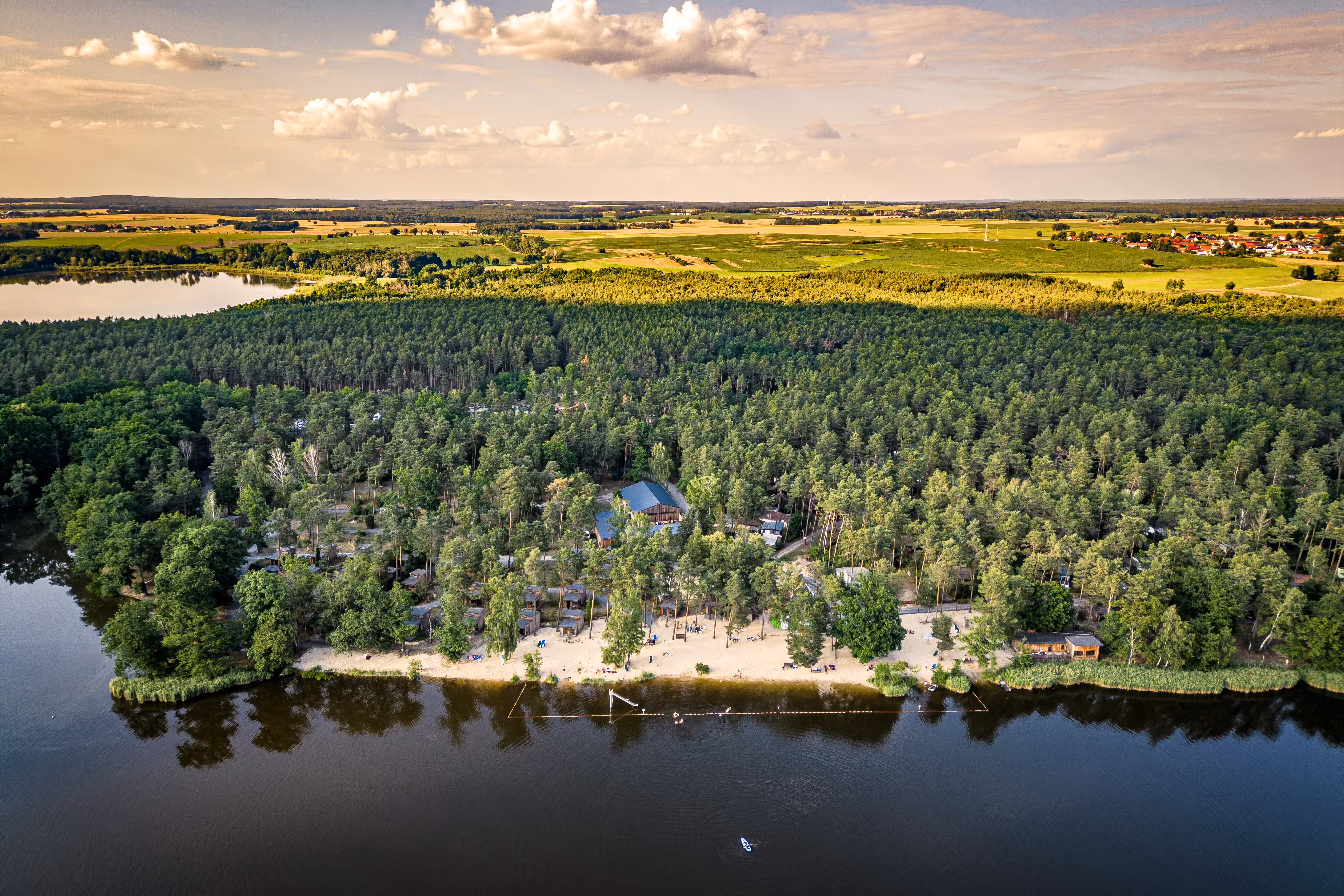 Etwa 150 parzellierte Stellplätze für Zelte, Wohnwagen und Wohnmobile bieten großzügige Flächen zwischen 75 und 210 m², viele davon im Schatten unter Bäumen. Zusätzlich gibt es rund 15 Dauerstellplätze und ca. 67 gemütliche Mietunterkünfte wie Tiny‑Häuser oder Mobilheime – teils mit eigenem Bad. Bei diesen Unterkünften genießen Gäste direkten Blick auf den See und den Sandstrand.