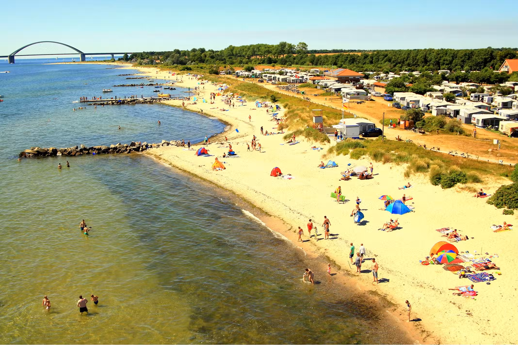 Camping Miramar liegt in absoluter Traumlage direkt am Naturstrand der Insel Fehmarn. Der Platz befindet sich nur wenige Minuten von der bekannten Fehmarnsundbrücke entfernt und bietet seinen Gästen einen fantastischen Blick auf die Ostsee. Die Umgebung ist ruhig, naturnah und geprägt von Wiesen, Wasser und frischer Meeresluft. Die Nähe zur Brücke erleichtert die Anreise enorm, insbesondere für Wohnwagen- und Wohnmobilfahrer.