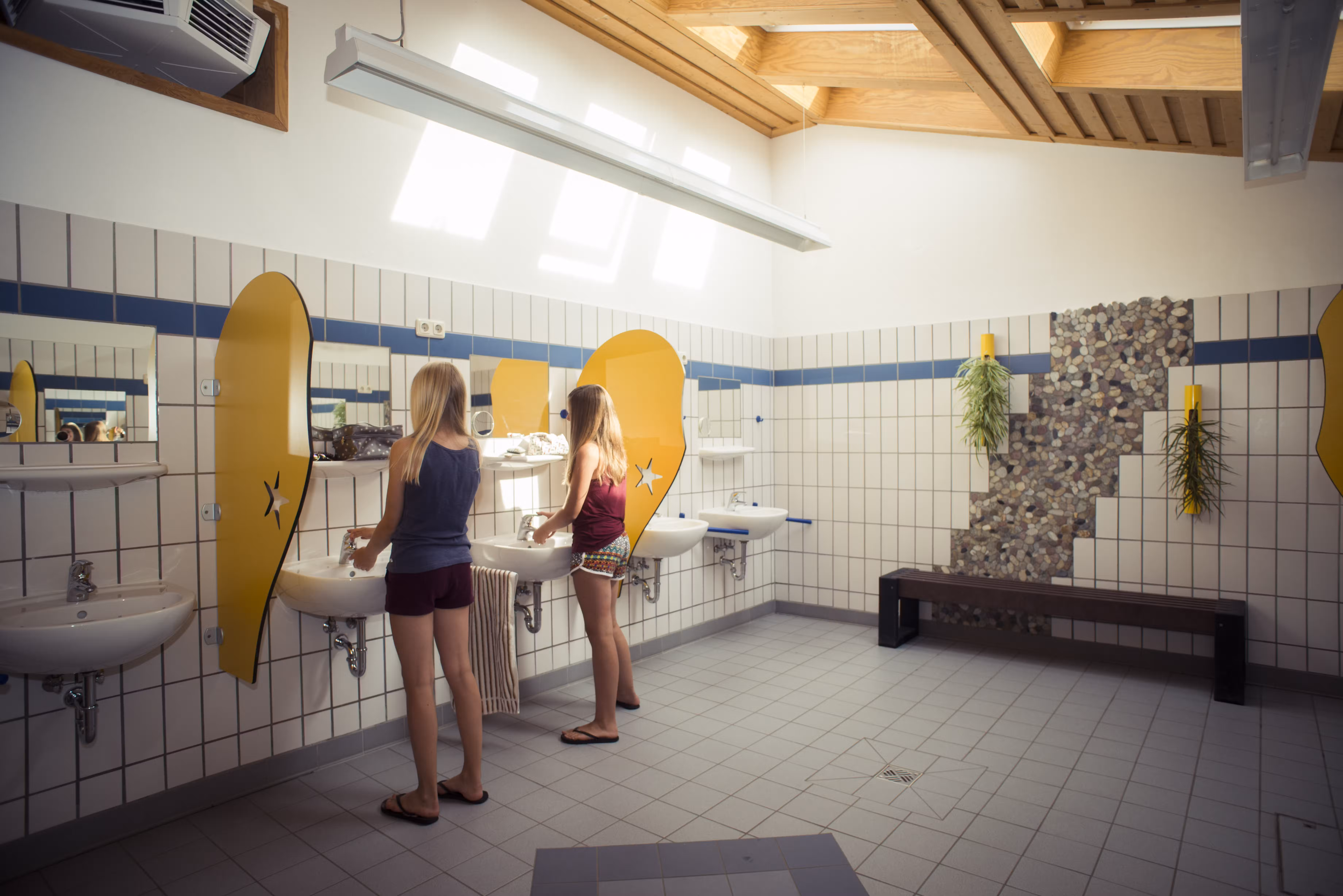 Die Sanitäranlagen sind modern und gepflegt, mit umfassender Umwelttechnologie ausgestattet. Es gibt einen Kinderwickelraum sowie ein barrierefreies Bad für Rollstuhlfahrer. Ein Campingmarkt versorgt die Gäste mit allem Notwendigen, während das sommerliche Südstrand-Bistro kulinarische Köstlichkeiten anbietet.